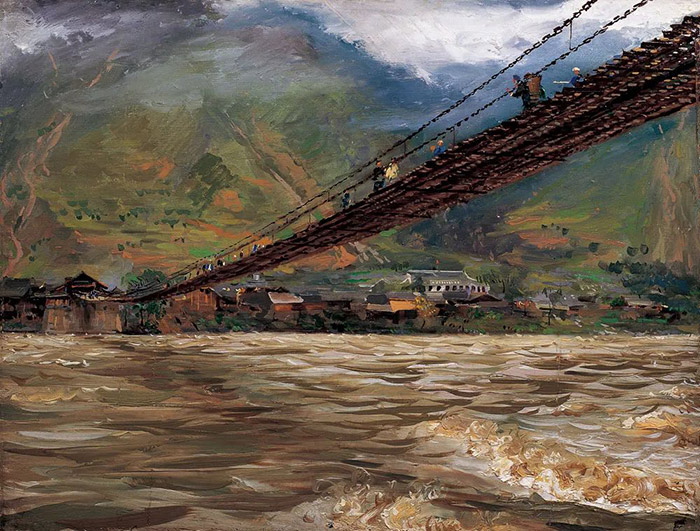 董希文,大渡河瀘定鐵索橋,木板油畫,40×53cm,1955年