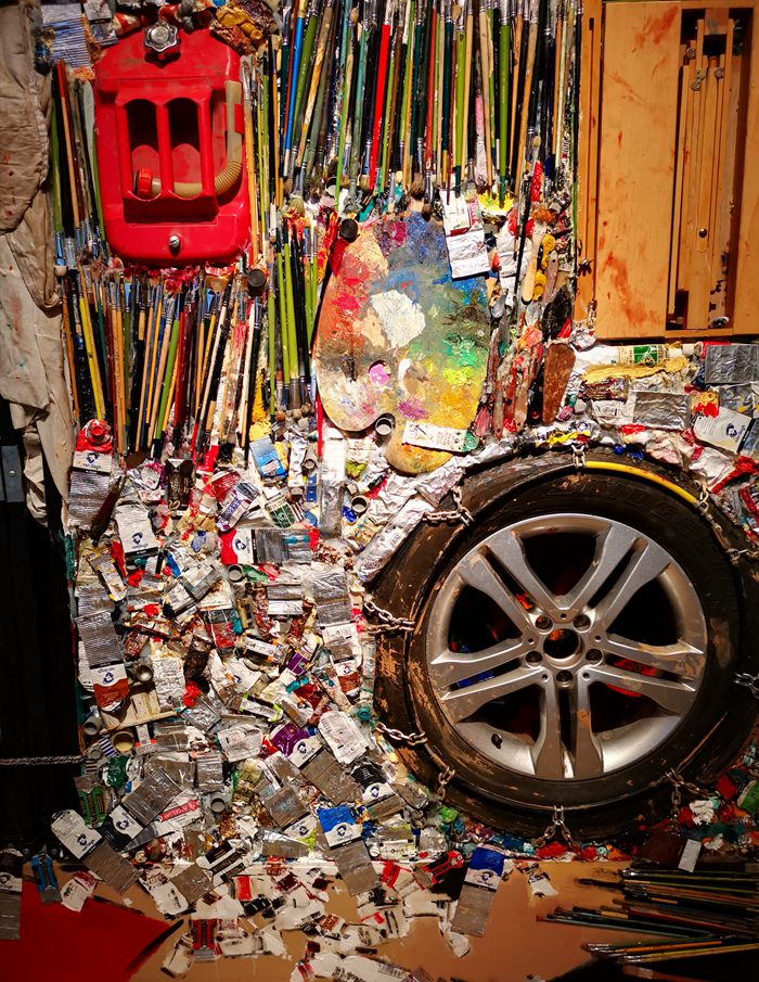 王克舉將寫生途中用過的畫筆顏料等做成了裝置作品