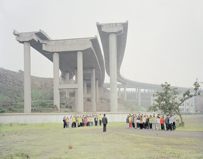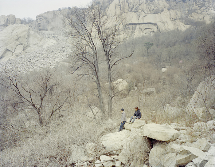 張克純的鏡頭保持著遠觀的距離,畫面中的人如螻蟻般微小,反襯出自然與人造景觀的巨大的體量空間,延伸了深遠的意境,這如同傳統山水畫中的設定。但他們的姿態更值得回味,他們保持靜默,佇立、端坐著凝望遠方,張克純在后期甚至將自己置身拍攝場景中,這些似乎象征著人在一個大環境和社會洪流中作為個體的存在,既微不足道又無力掙脫,不喜不怨、孤獨自洽仿佛是這個時代人精神的寫照。