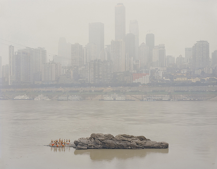 2011年張克純的作品《在江中的石頭上》,照片記錄了重慶的東水門大橋,場景中的人物為冬泳愛好者