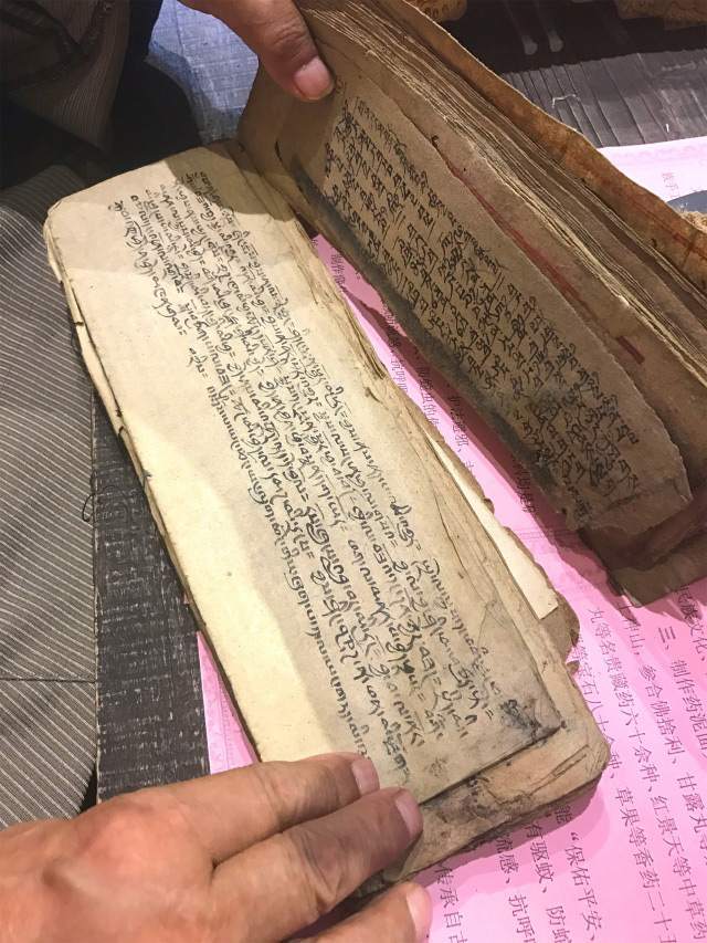 “這些書已經完整地傳承了二百余年,上面對于藏傳藥泥面具的制作工藝有著詳盡的介紹,是我的‘命根子’。 ”四龍大叔小心翼翼地打開祖上留下的珍貴手稿——一摞用布包裹的紙張,顏色早已泛黃,但是書寫的內容卻依舊清晰可見。