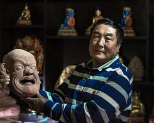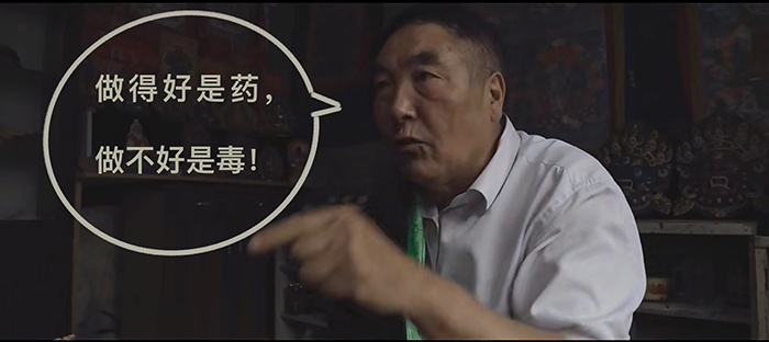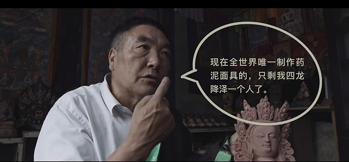 在距離成都700多公里的新龍縣,它位于甘孜州腹心地帶,有肚臍縣之說。新龍的藏語意為“林間的河谷”,四龍降澤從小生活在這里,制作藏傳藥泥面具他的祖傳手藝。這位四龍大叔制作的藏式藥泥面具,融合了民族、宗教文化、工藝美術甚至是醫學領域,它是民族的,是全國人民的,是全世界的。他用一雙老手守住了這一傳承了1300多年瀕臨失傳的技藝。