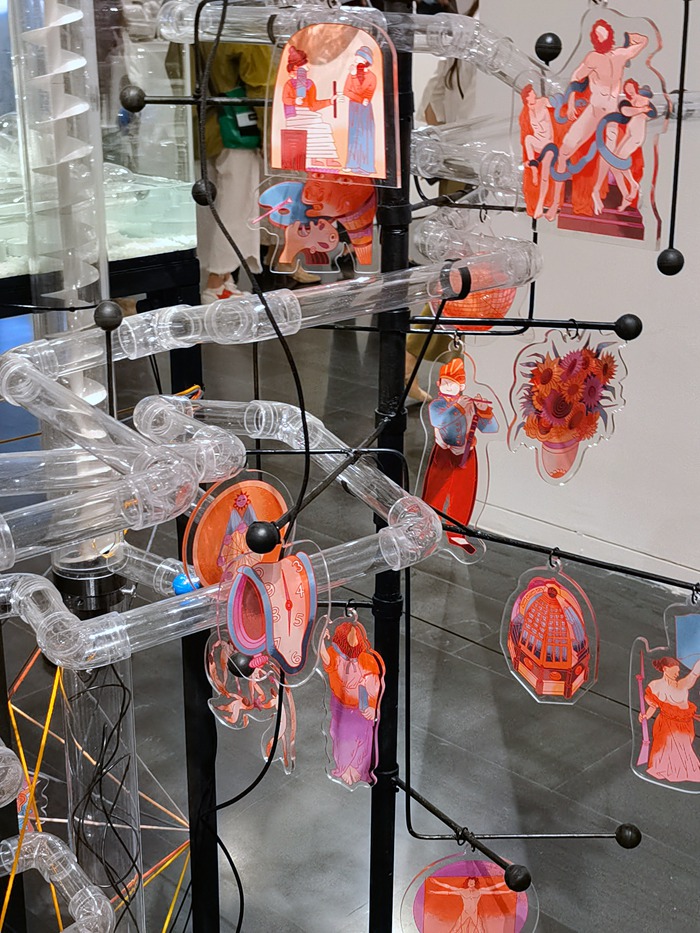 小球首先進入如維納斯一般的水中誕生,在波提切利的春神與風神的幫助下,前往求索之路。在盤旋著的求索之樹中,我們依次學習各個學課也學習一切夢想需要的拼圖。這時或許我們會來到迷失之地,經歷隨波逐流,經歷曲折糾纏,終于找到自己唯一的通路,重塑自我,繼而打開筑夢之門,完成“重生計劃”。經過代入-誕生-求索-隱喻-迷失-抬升-重塑-筑夢這八個步驟,或許代表著你的小球能找到你最初的夢?