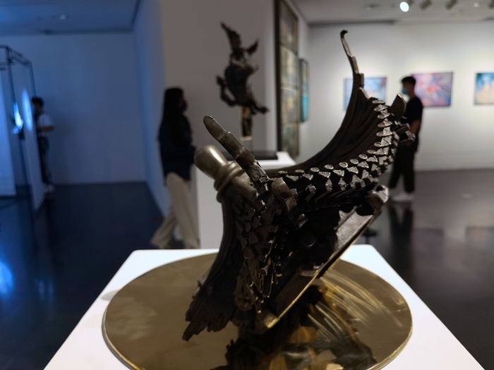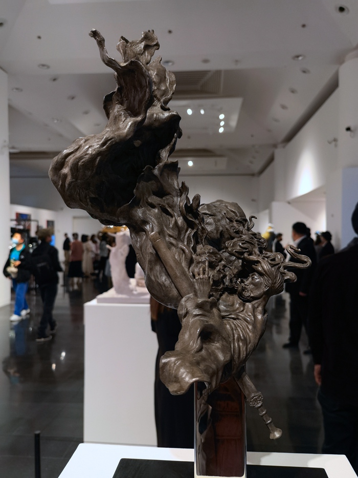 來自雕塑系的范曉辰,他的提問是什么?或許正是對于傳統怎樣繼承與發展的思考。在《懷石·懷沙》的雕塑中,他塑造了一個自天際墜落的劍客,他飄逸的長袍與披散的長發有魏晉風骨的瀟灑也有著寫意畫中肆意的線條?!督隆防?,曾經巍峨宮闕只剩下斗拱飛檐,以傾斜的角度崩塌著,但金屬鑄造將原本木構的建筑凝固成了永久,在這里即使崩塌即使損壞,還有一個飛檐的一角劃出優雅而完美得曲線,倔強得直指天際。無論是材質、技法、形式、內容如何表現,中國傳統的精神內核值得珍視,中華文化的文脈值得延續。