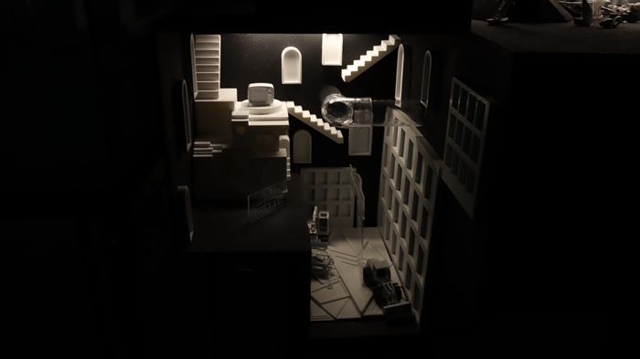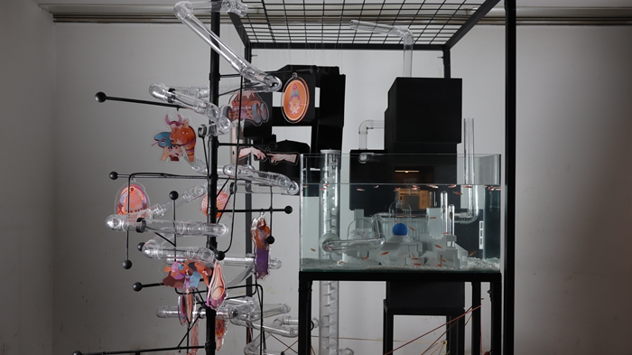 來自基礎教研室的張林溪在《重生計劃》中制作了一個體系完善的機械裝置,在這里,她想要思考日和在長大后,經歷迷失的社會網絡,集體意識附加后,保持初心實現童年夢想?在這個“造夢”機器里,關中可以參與其中,在入口處投入代表自我的小球,看看自己能走到“造夢游戲機”的哪一個關卡。我們在無數實驗中開啟了通往經驗的道路,通過投入的動作完成重塑自我的儀式。