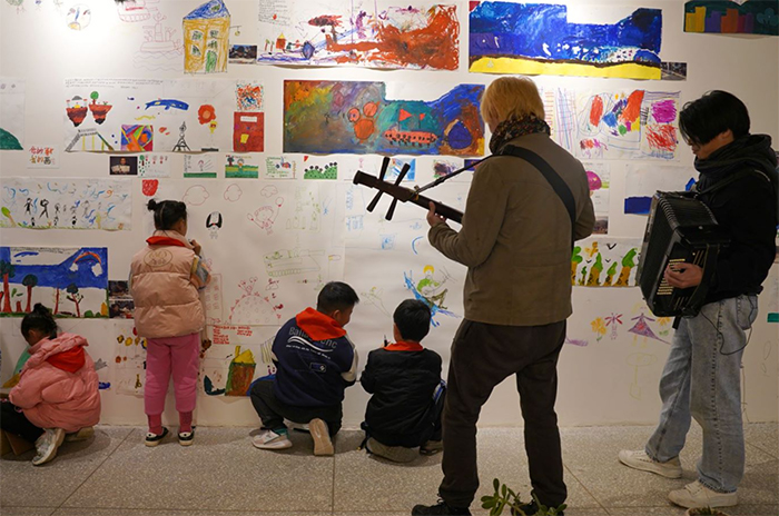 小河、仁科在“你的歌,我來畫”兒童畫展開幕現場,攝影:《中國那么美》節目組
