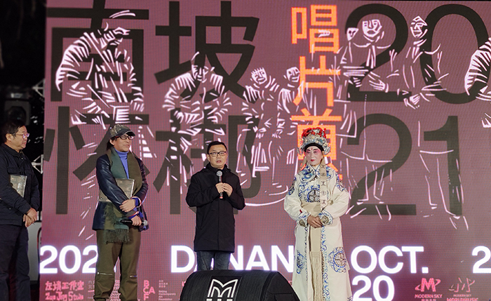 懷梆戲唱片首發無疑是本次藝術節的一大亮點。2021年10月20日晚,張曉舟、左靖,丁路與懷梆劇社負責人趙小景出席了《南坡懷梆2021》唱片首發儀式。戲曲在中國古老鄉村文化中曾經占據著重要的地位,如今戲曲在鄉村公共文化生活中的作用已經被人淡忘了。陳奇團隊經過與村民溝通協調,將大南坡村中斷了40多年的本土懷梆戲再次上演。趙小景是村里的懷梆戲老藝人,她告訴記者,懷梆戲區別于其他戲種,這是懷慶府八縣的地方戲,道白、念白、唱腔都體現了懷慶府這一帶的地氣,“從清末懷梆戲發起,經過幾起幾落后,如今還能唱起來實在不容易”。