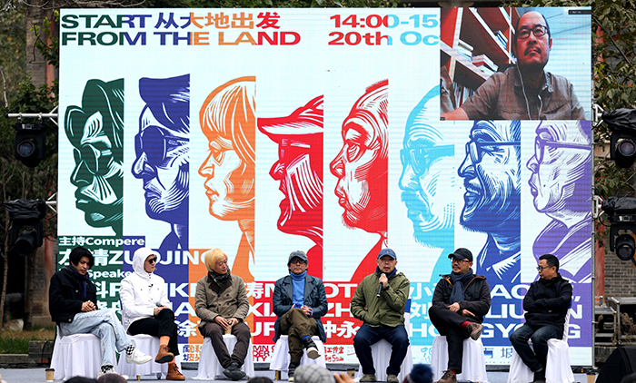 10月20日下午,左靖、張曉舟、仁科、茂濤、小河、涂飛、劉慶元和鐘永豐在“從大地出發”論壇中暢談了音樂與鄉土的關系。五條人樂隊的仁科和茂濤分享了與左靖交往的故事,五條人樂隊早在2011年就參加了左靖策劃的碧山豐年祭,那時的五條人樂隊還只在南方小有名氣,他們曾在碧山寫下一首經典的《城市找豬》,歌中唱到——“農村已科學地長出了城市,城市又藝術地長出了農村”。這句話后來被左靖經常引用。十年后,五條人樂隊已經成為中國最炙手可熱的樂隊之一。左靖談到五條人樂隊時說:“本次藝術節邀請五條人樂隊演出,并非出于五條人目前的熱度,而是五條人音樂有太多鄉土的東西,他們引入了家鄉廣東海豐的漁歌、戲曲、民謠元素,我們希望五條人的歌跟大南坡懷梆戲能夠產生碰撞...”