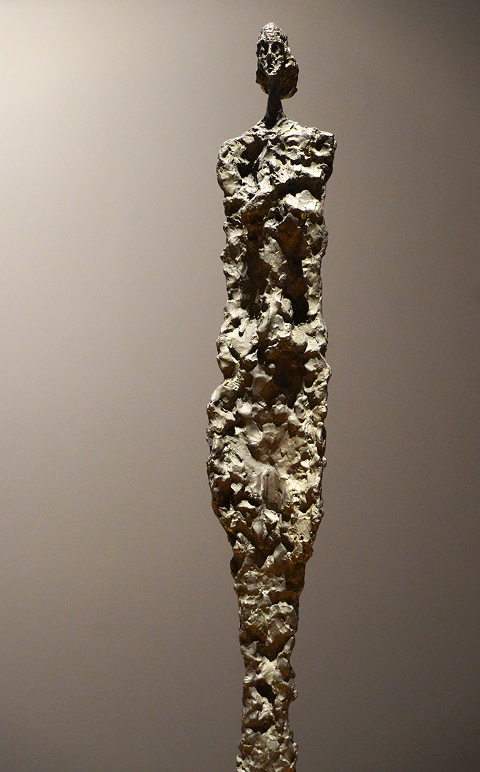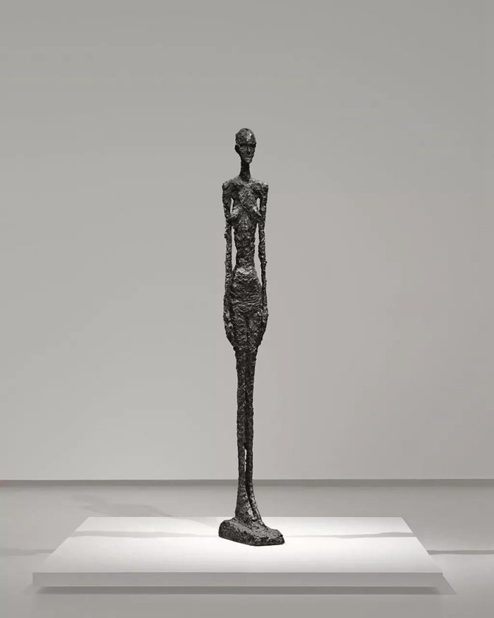 面對賈科梅蒂作品的時刻無疑是凝重的,展廳厚重的大門和密閉的空間已經對此提供了支持。這些雕塑的神奇之處是,你離它遠時,感到被強烈地吸引,等你走近時,它又在拒絕你,于是你就在這進退失據中不斷地徘徊。最先吸引你的是《高挑的女人II》,她那么高,你便想回過頭去看另一位矮些的《威尼斯女子III》。