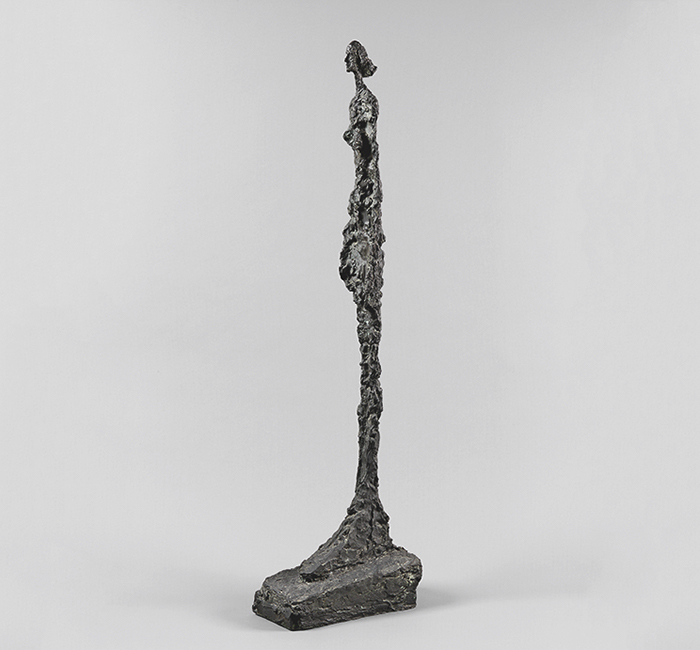 賈科梅蒂于1901年10月10日出生在瑞士的博爾戈諾沃(Borgonovo)。因其父親是畫家,他年紀輕輕就接觸了后印象派和象征主義。他于1919年畢業,離開學校后便前往日內瓦美術學院學習。1922年他移居法國,在巴黎的大茅屋藝術學院研習人體藝術,也與雕塑大師布德爾(Antoine Bourdelle)學習雕塑,并經常參觀盧浮宮。他的創作使他趨近了后立體派——尤其是1926年的《倆口子》(The couple)和1927年的《匙形女子》(Spoon Woman)。后來他也加入超現實主義的團體中發展——1930年的《懸浮球》(Suspended Ball)雕塑,在巴黎皮埃爾畫廊與米羅(Joan Miró)和阿普(Jean Arp)聯展,這一作品也標志著他的重要轉折點。1935年,他脫離了前衛藝術圈,開始全心致力于以真人模特為參照對象的創作方式。二次大戰期間,他于1941年回到瑞士,遇到了他未來的妻子安尼蒂?阿爾姆(Annette Arm),她成為了他最喜歡的模特之一。戰后時期,他開始創作高挑瘦削的人物形象。到了1950年代,賈科梅蒂的聲譽大為提高。于1956年,他代表法國參加了威尼斯雙年展并展出《威尼斯女子》(Women of Venice),后來他于1962年獲得了威尼斯雙年展的雕塑類首獎。1965年最后一次離開巴黎之前,賈科梅蒂創作了攝影師埃利?勞達爾(Eli Lotar)的三個雕像,勞達爾成了他最后的一位模特。