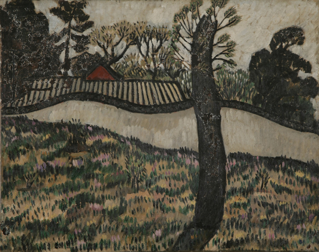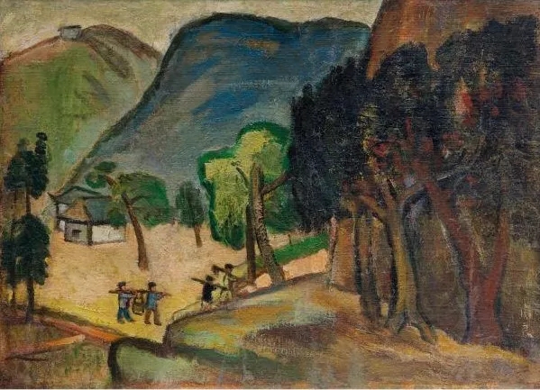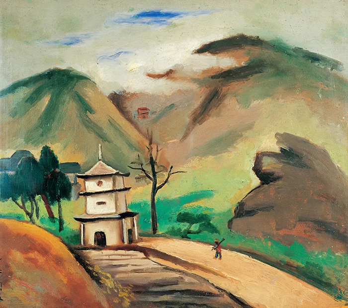 自20世紀20年代起,關良就致力于將中國畫的韻味融入油畫。作品《西樵》描繪了云霧下的山峰、路邊的白塔,還有一位扛鋤頭的農夫點綴其間??彰傻囊饩?,宛然一幅山水小品。同時他突出線條語言和筆觸的書寫性,用色大膽,借鑒了后印象派對山石結構的處理,體現出扁平的空間秩序,有著原始、古樸的美感。