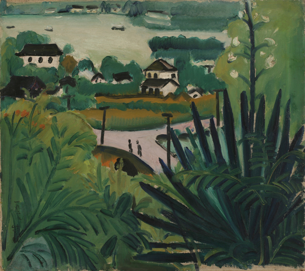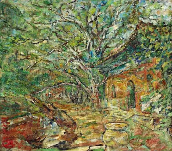 關紫蘭(1903-1985)學習野獸派的表現技法,主觀提煉了色彩的純度,強調筆觸的書寫性。這幅《西湖風景》用別致的構圖,從茂密的植物中遠眺西湖水面,房屋、植物和人物的筆觸各不相同,趣味盎然。畫家很好地駕馭了大面積的綠色,使它們呈現出不同的純度和色彩傾向。中間的小路透露出粉紅色,與周圍產生了補色的對比關系,可見關紫蘭在當時已經對西方的色彩體系有深入的研究。