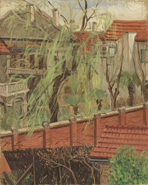 邱堤(1906-1958)早年留學日本,當時的日本盛行印象派、野獸派和后印象派的風格。因此在她的畫面中多弱化光影,突出色彩和構成的美感,富于裝飾性?!洞巴狻访枥L的是上海的民居,畫家筆下的窗外似是早春,楊柳依依,生機盎然,令人感受到平凡生活中的片段之美。