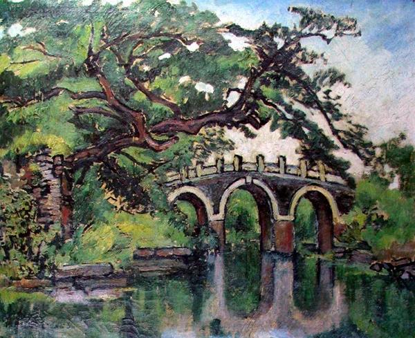 王悅之試圖在風景畫中注意區分筆觸的不同特點,并將油畫中的線條賦予其審美的獨立性。畫家弱化了色彩,近乎單色的畫面使它更接近中國的文人畫。在《北海公園一隅》中,山形的院墻掩映著遠處的屋頂,草地的短筆觸和樹干的長筆觸體現出不同的質感。在白墻上也可以看到這種平行排列的線條,它們可能來自于印象派的技法。這里也可以看出他將中國畫筆法融入油畫風景的嘗試。