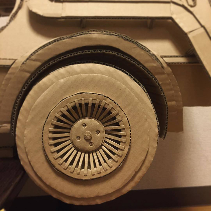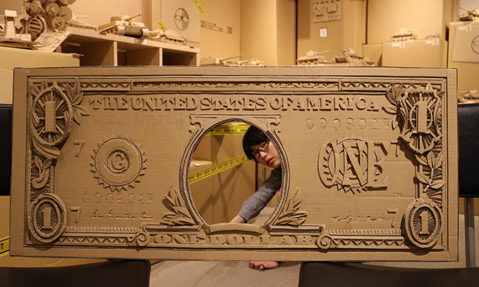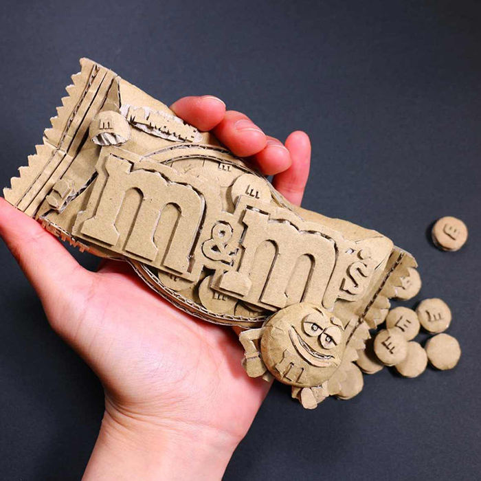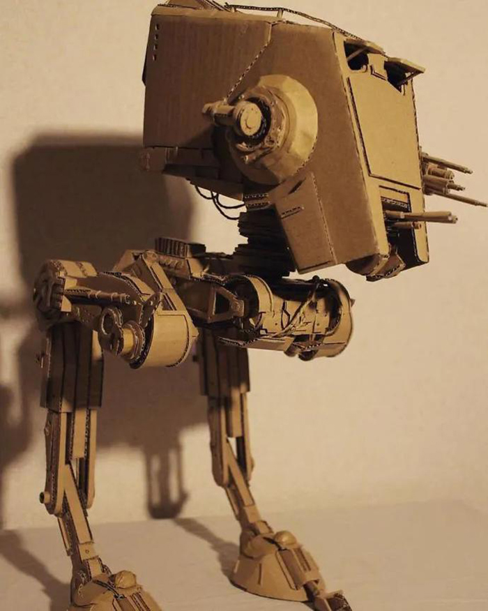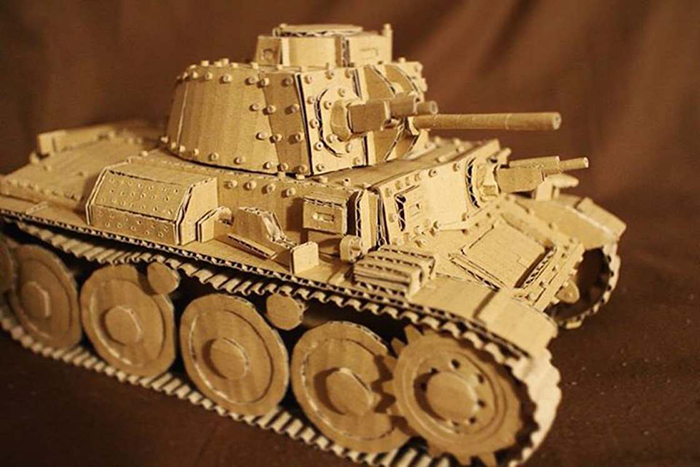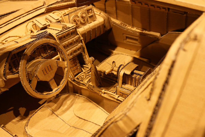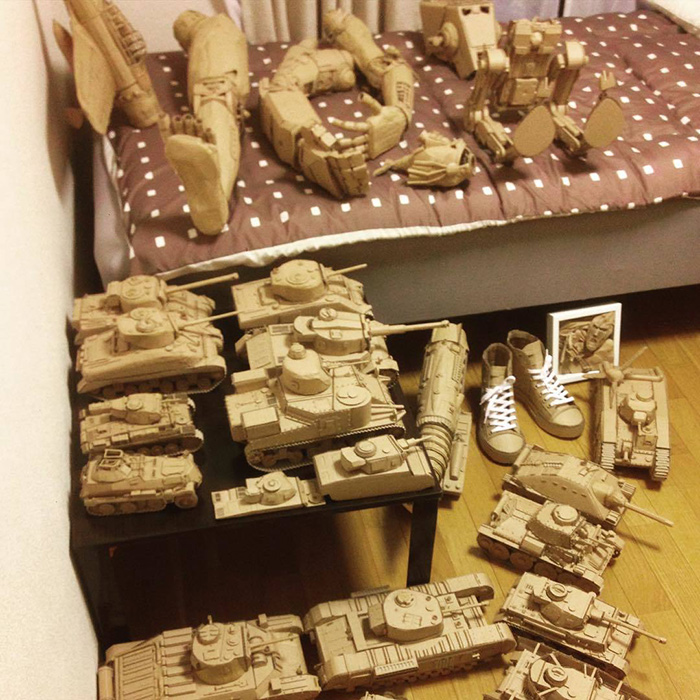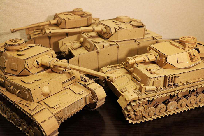 Monomi Ohno創作的紙箱作品,小到零食鞋子小動物,大到汽車坦克甚至宇宙戰艦,每一件作品都是細節滿滿、極致細膩,每一個零部件、每一顆鉚釘、每一處接駁點都是有依有據,經得起推敲考究,可以說真實還原了。
