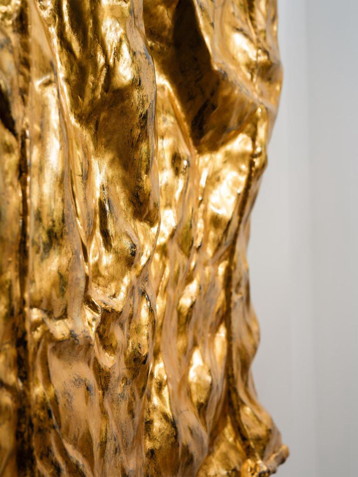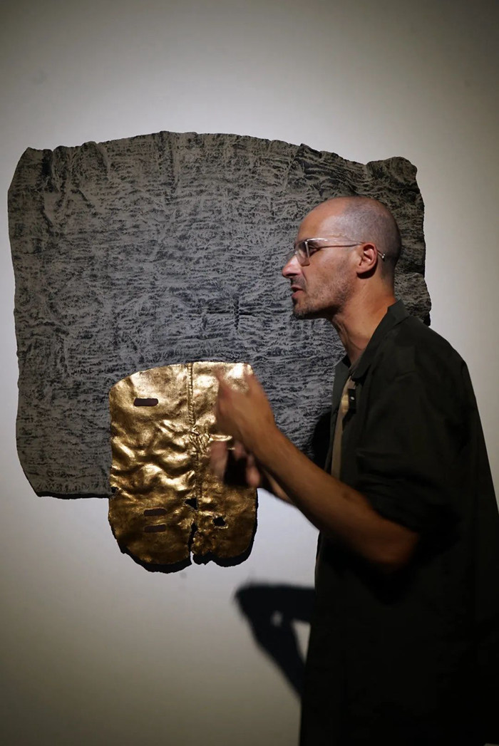 他對舊米袋也是偏愛的,他認為米袋曾經作為實用之物,如此不起眼又“吃苦耐勞”,基本上是被用完即棄;但它曾可能去過很多地方,承載了很多東西……于是就有了以米袋為載體的代表作作品,米袋褶皺的肌理被覆蓋在平滑如鏡的金箔之下,而金箔也因此有了褶皺的肌理,兩種截然不同的材質似乎渾然一體,遠望之如灑滿陽光的山巒,重巖疊嶂;而細節的材質銜接部分則以大漆自身的色澤變化(乳白、棕褐、漆黑三色)展現生命孕育的初始形態,訴說著自然的本源。