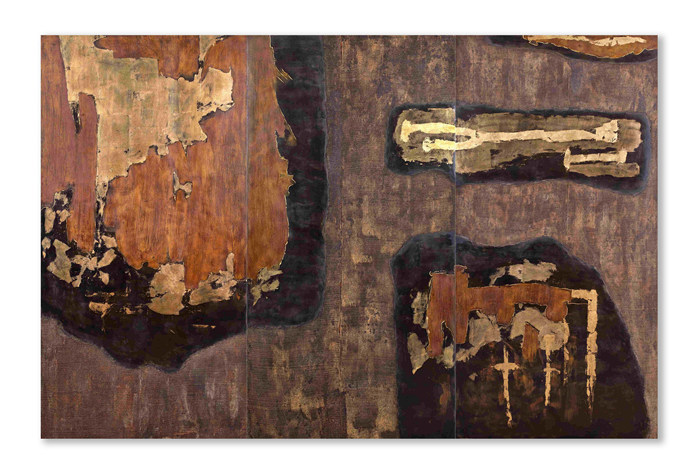 文森·漆,無題,2013,三聯幅,大漆,亞麻纖維織物,氧化銅箔、金箔繪于木板,180 x 270 cm (180 x 90 cm每幅)(圖片由杜夢堂畫廊提供)