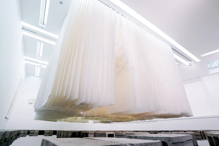 鏗鏘又輕盈,這是我對林延作品的感覺。林延的作品氣質有道家的意味,一種從無到有的境界,慢慢滋生、氤氳開來的氣質——“有有也者,有無也者?!倍牟牧蠠o非宣紙和墨水。我曾在不同的空間遇見過林延的作品,她的宣紙,都是如雕塑般懸掛于空間。觀者可以在懸掛的宣紙間穿梭,去感受、撫摸宣紙的肌理,還有它在不同空間會被褶皺的不同形態。有時候,腳下的路是平滑的大理石;而有一次,是墨水積聚的小河,你需要踩著石墩子走過去。