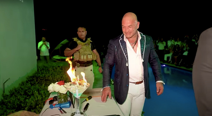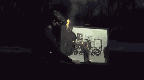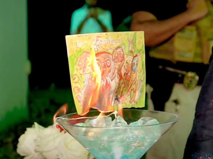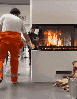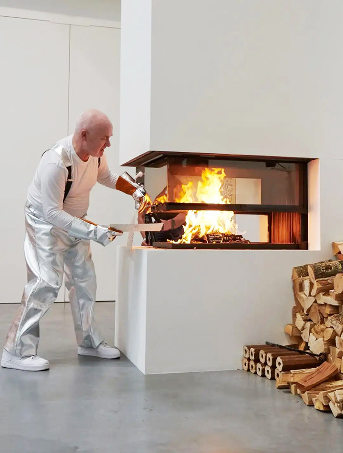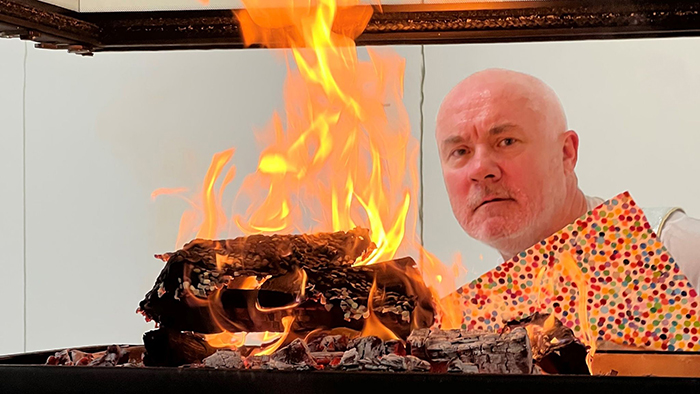 現年57歲的達明安?赫斯特身穿防火防熱的特制衣服和手套,一身輕松的將畫作投入六個玻璃火爐當中,還時不時朝鏡頭扮個鬼臉。