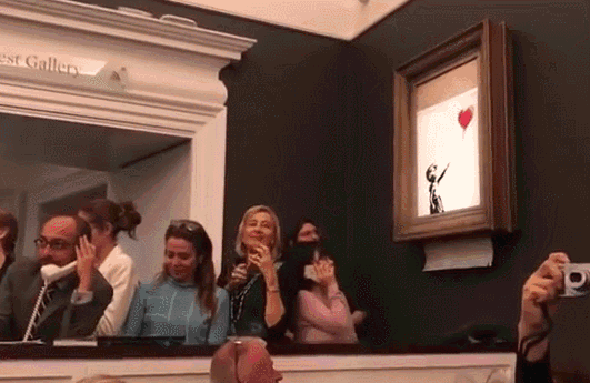 其實在藝術圈,赫斯特并不是第一個在NFT領域“玩火”的人。在2021年3月8日,著名街頭藝術家班克斯的作品《Mornos》(《白癡》),被其持有者燒毀并全程視頻直播,其NFT作品價格最終暴漲4倍并售出;班克斯本人也曾對自己的作品下狠手,在拍賣現場用碎紙機毀掉了剛剛拍賣成功的畫作,以此完成NFT的轉換,這幅作品的購買者震驚之后驚喜表示“其價值空前”;同樣是在2021年的9月份,一位名為“Shl0ms”的NFT藝術家炸毀了一輛全新的蘭博基尼Huracan跑車并制作成NFT,就像跑車里蹭蹭冒出的火焰,其NFT作品價格躥升了數倍。