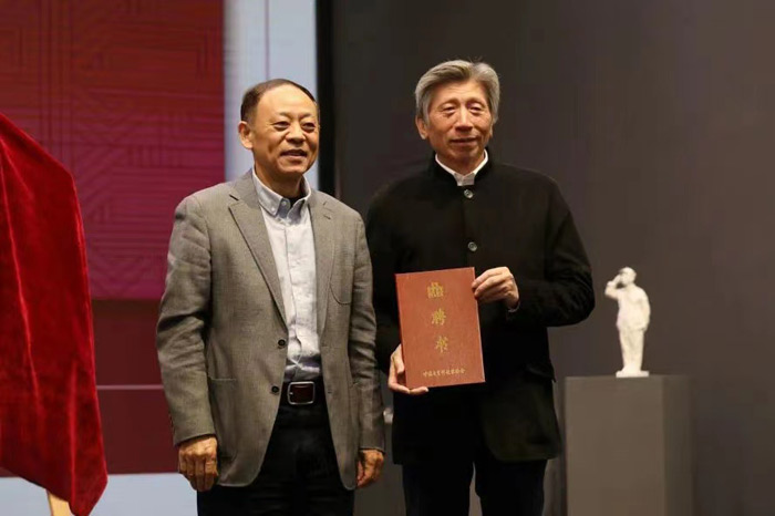 中國文藝評論家協會主席夏潮為中國文藝評論(中央美術學院)基地主任范迪安頒發聘書
