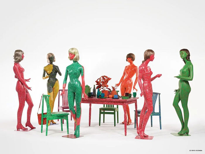 草間彌生 ,《自我消融》,1966至1974年,彩繪人體模型、桌子、椅子、假發、手袋、馬克杯、盤、水瓶、煙灰缸、塑膠植物、塑膠花、塑膠水果 ,尺寸可變,M+ 。?草間彌生。圖片:M+,香港