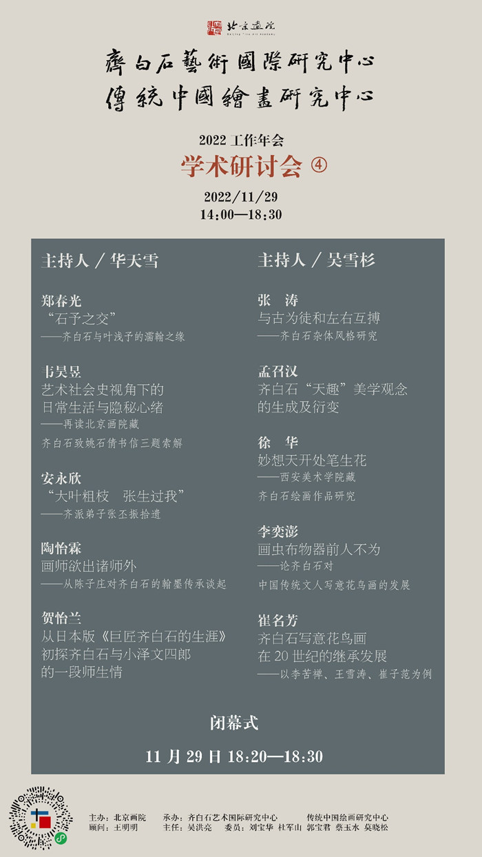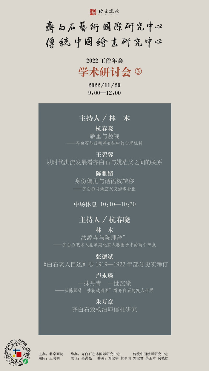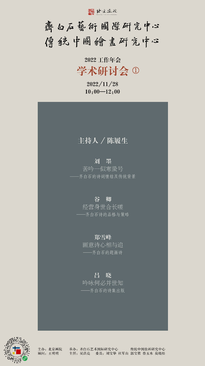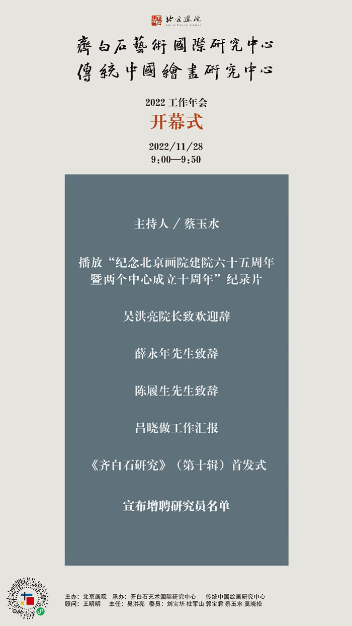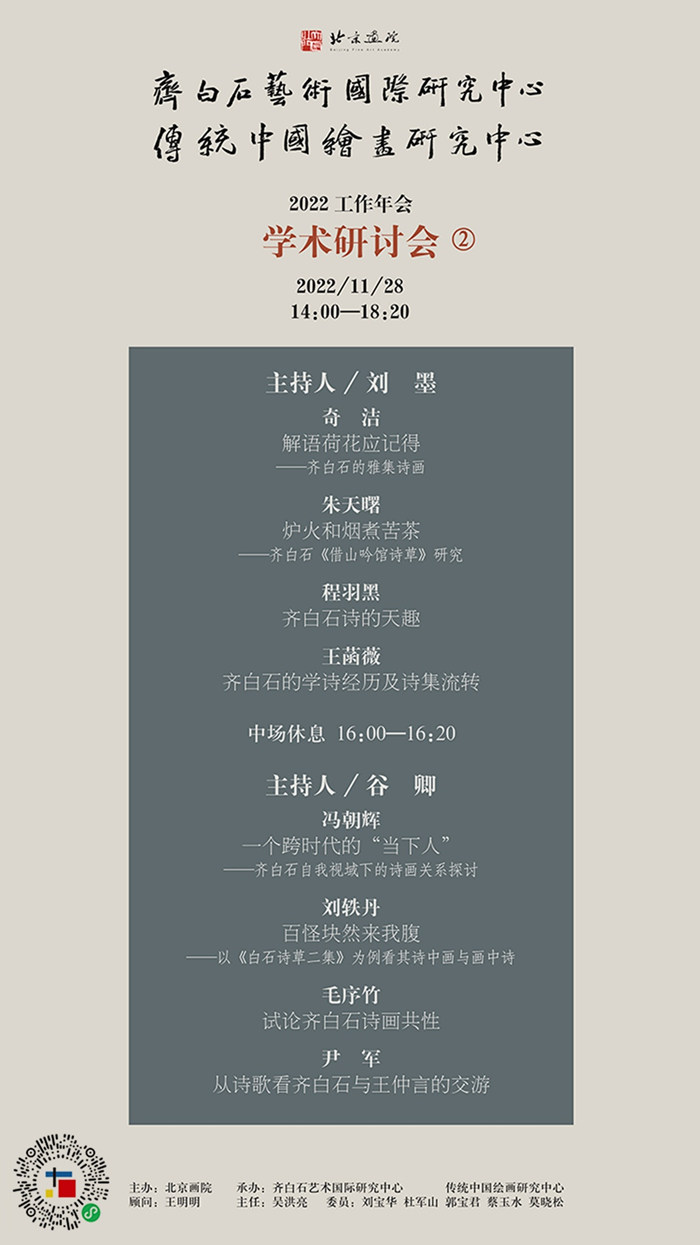 為共享最新研究成果,北京畫院擬于2022年11月28、29日舉行“齊白石藝術國際研究中心”暨“傳統中國繪畫研究中心”2022工作年會,將有29位來自全國各地的學者相聚于云端,以齊白石的詩歌為主題,兼及齊白石的生平及藝術等多個議題展開深入的研討和廣泛的交流。因防疫需要,今年的學術年會將全部通過騰訊會議舉行,并通過“在藝”全程直播,歡迎廣大關心北京畫院成長和關注齊白石研究的專家學者和觀眾掃碼觀看。