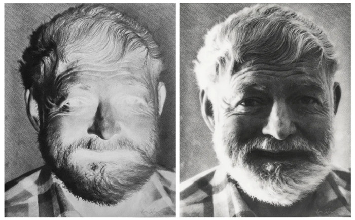 李舜,《肖像-Ernest Miller Hemingway》,紙上素描·8×10英寸黑白大畫幅底片,25.4×20.32cm×2,2017年。