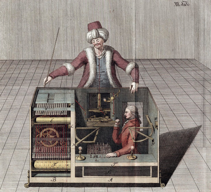 有一個故事,我至少從沃爾特·本雅明的《歷史哲學論綱》(1940 年)中了解到,拿破侖時代,有一個會下棋的機器人,它穿著土耳其服裝,嘴里叼著水煙,坐在一張大桌子上的棋盤前,表面上稱為“機械土耳其人”,正如它所稱的那樣,它能夠“對棋手的一舉一動做出反應,并采取反擊,確保贏得比賽?!?nbsp;這個機器人會巡回在法庭和沙龍,以其奇妙的機械裝置讓旁觀者驚嘆不已。但這一切都只是幻覺。在看起來透明的桌子里面,有一個鏡子系統,坐著“一個駝背矮人——一個國際象棋大師”,他可以看到比賽,并會操作木偶回應他的對手。機械土耳其人并沒有“真正”做任何事情。它是無用的——直到被特定的人類技能激活。