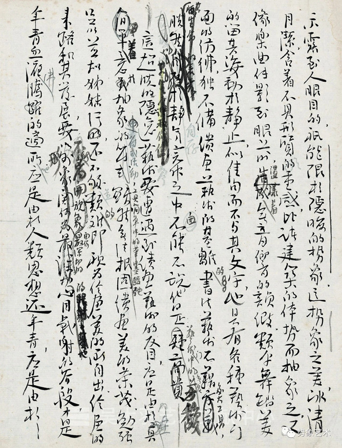 “藝術、文化是表達時空的結構(structure),時空是輪回的,大和廣。創造發明才是人生的自由。人生也有起步,前身曰畫自由,后身曰畫‘大悲’,大徹大悟才能獲得大自由,而人生的價值在自知。藝術創作就是自我批評。藝術靠個人感受。藝術就是自己發現自己,表達自己而已。藝術作品的時代性可以概括:動、力、勢、變。形的變動、力的變動,達到勢的階段,變動包括時間、空間。勢隨形象變,事實上形象結構之外,也有勢。時間不會停留,藝術也不要停留。中國畫和書法確實有陳陳相因的一面,陳陳相因的藝術悲慘得很,可憐得很;現在我們可以從書法中去深化,用政治上的時髦話說:‘需要一場革命’,因為它(藝術)是生命。書法活動不離開尊嚴,更不能損害書法的尊嚴。書道、畫道,同歸于道,書道不能概括畫道,要相通、并列。油畫可以從孔子的‘道德論’中解放出來,油畫大有前途,但否定孔子是錯誤的??傊?,油畫不應成為‘道德教育’的依附?!?/p>