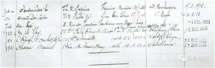 圖中第三行為法國國家檔案館AJ52-572號文件中吳大羽在巴黎高美的注冊記錄(圖源:杰奎琳文化藝術)