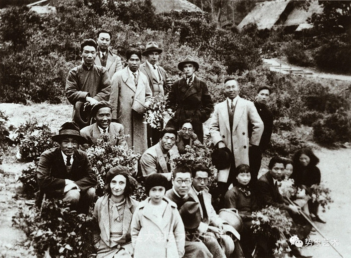 1935年,國立杭州藝專部分教師及友人于白龍潭郊游留影(邱璽攝影)。前排蹲坐者左起:林風眠夫婦、女兒蒂娜、潘天壽、吳大羽、蔡威廉、林文錚;中排左起:劉開渠、李樸園;后排站立者左起一、二、四、六分別為:郁達夫、侯慕彝、杜勞、方干民
