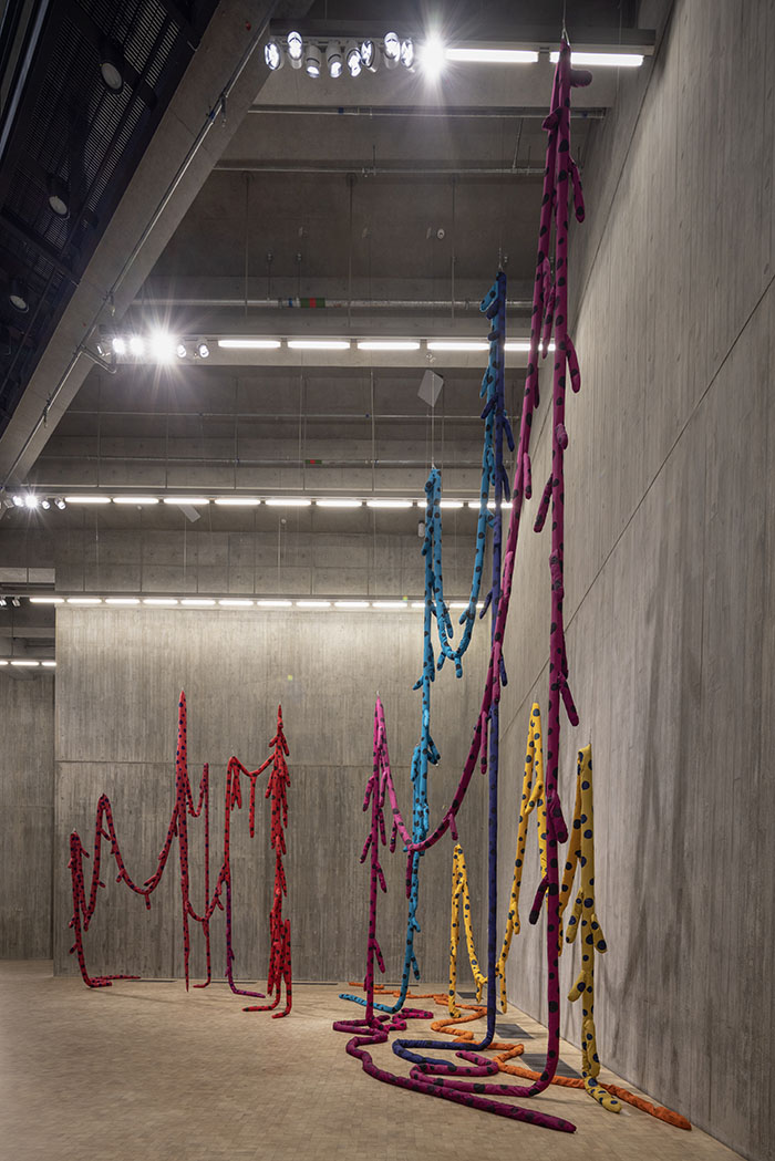 為回顧展新創作的三件作品中的第一件名為《神經的死亡》,這一裝置作品中有很多軟雕塑,像是延伸出來了很多手臂或是樹枝,有紅色、藍色、黃色、紫色等多種顏色,全部由波點覆蓋。這件作品連通博物館大樓地面與地下三層樓深即20米左右的光庭,從上方垂掛至博物館地下的“潛空間”(B2層)。草間彌生的這件作品匠心獨運,充斥著建筑空間,就像是垂下的光束,也像是在建筑空間中所創作的繪畫與雕塑作品,可以從建筑內的多個角度進行觀賞。這件作品的靈感來源于其1976年的作品《神經的死亡》,這件早期作品也展出在了本次回顧展中。這件早期作品創作的靈感來源于70年代草間彌生正在遭受的精神抑郁,她在1977年回到日本自愿在精神療養院接受治療。因此在45年之后,草間彌生為M+新創作的這件作品顯得更加得與眾不同,這件作品有著更加巨大的體量,也有著更加豐富的色彩,并且洋溢著歡樂的氛圍。走在這件作品周圍,看到這些懸掛著的巨大的軟雕塑,能夠感受到作品帶來的具有魔力般的體驗,就像行走在童話森林中,也像是面前出現的非常友善的巨大怪獸。