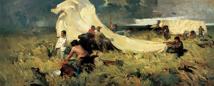 詹建俊《起家》布面油彩 140cm×348cm 1957年 中央美術學院美術館藏