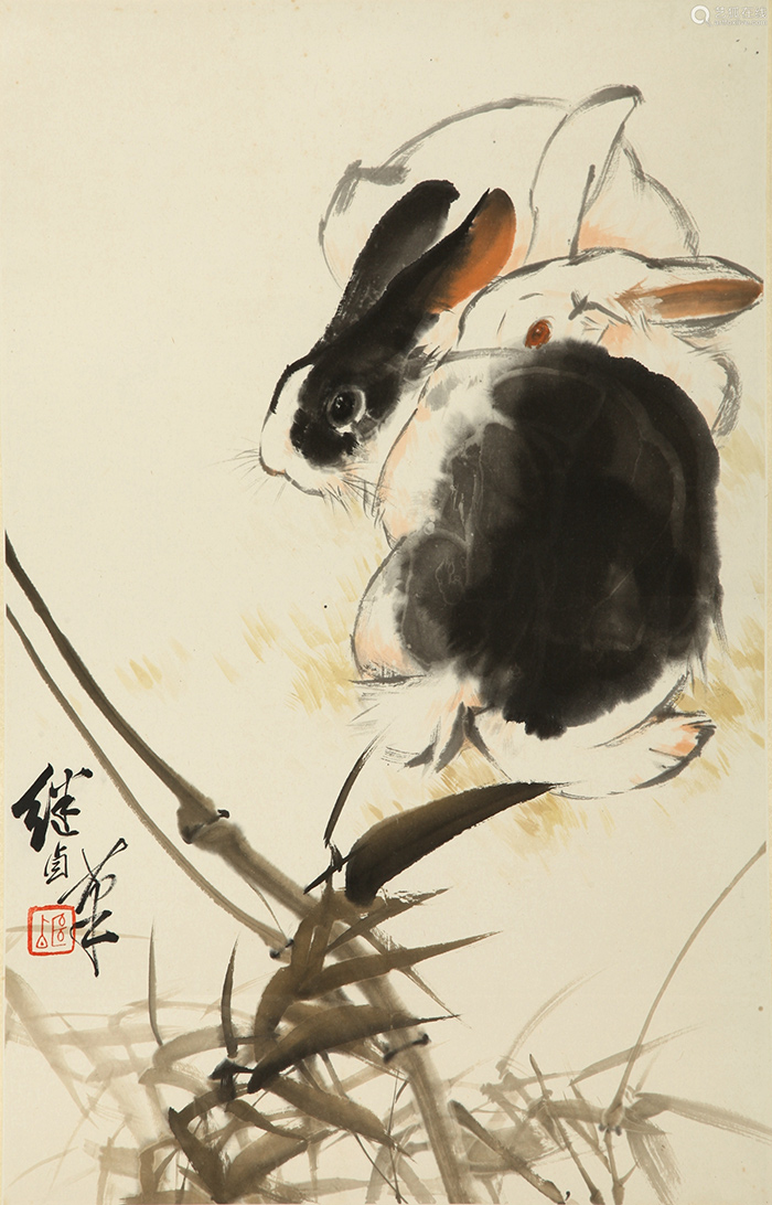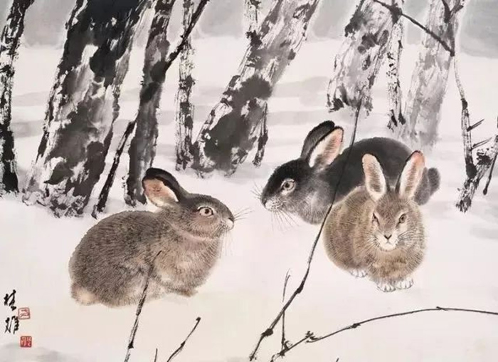 方楚雄筆下的兔子姿態各異,描繪了兔子的不同生活環境,可愛而不失靈動。畫家本人深受嶺南畫派的影響,同時偏好宋人花鳥畫。他的花鳥畫既不失傳統的法度,又充滿濃郁的生活氣息。