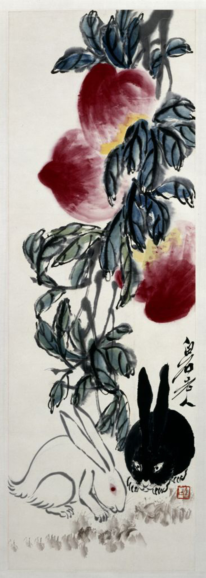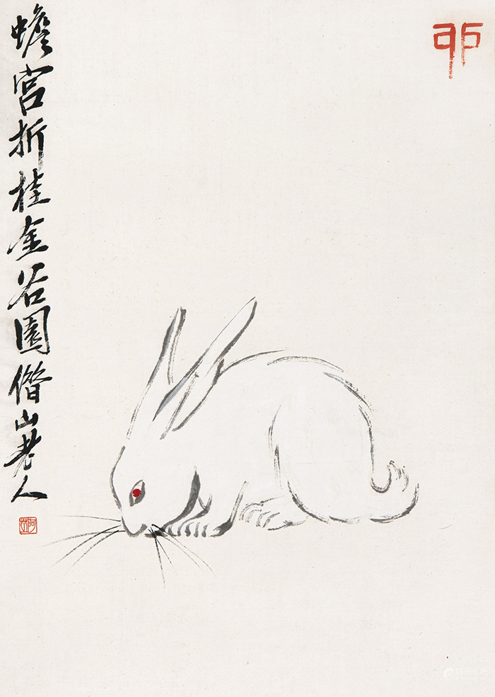 除蝦外,白石老人與兔的故事也令人稱道——為了畫好兔子,他曾親自養了數只黑白兔子,常常仔細觀察他們的生活習性,以及細微動作。在觀察的基礎上,他創作出了一批精彩傳神的兔子畫,一時吸引慕名而來的人,成群結隊來上門“買兔”。