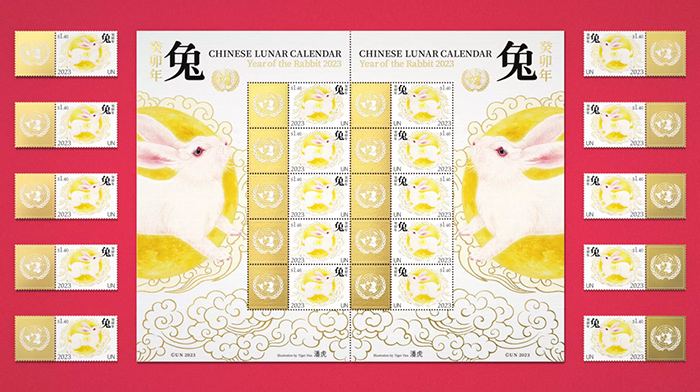 中國兔年,全球矚目。聯合國對于中國文化的認可度與日俱增——中國設計師潘虎為聯合國設計的這款郵票,月兔采用極具中國特色的繪畫技法“工筆”。結合白描繪畫的祥云,簡練干凈,無需繁復的修飾,一只生動傳神的兔子便已然騰云而上了。性情溫和、潔白無暇的兔子,亦能彰顯聯合國存在的意義——以公平正義的態度,積極維護世界和平,發展國家之間的友好關系,促進世界文明向上發展。