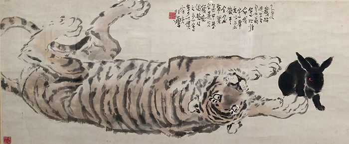 這幅徐悲鴻送予伉儷友人的虎兔圖十分耐人尋味——藝術家將猛虎與黑兔并置畫面,以此構成了畫作的敘事情節,為觀者提供了豐富的想象空間。老虎與兔子,本應為捕食狩獵的關系,而作品中的老虎則如同“大貓”,慵懶戲兔,兔子的狀態也及其松弛自然,二者親密無間?;⑼弥晗嘟恢H,猛虎迎瑞兔,寓意吉祥順遂。