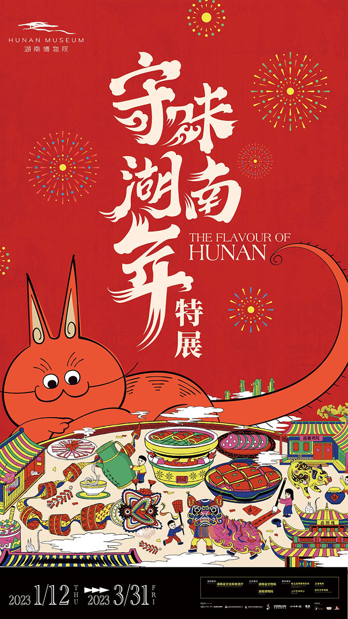 癸卯年春節,湖南博物院推出“守味湖南年”,以院藏文物為基礎,向參觀者介紹湖南地區豐富多彩的年俗、年味、年貨。策展方特別為本次展覽設計了吉祥物“守味貍”,靈感來自長沙馬王堆漢墓出土的西漢貍貓漆盤,藝術風格上則借鑒了灘頭年畫的視覺語言。
