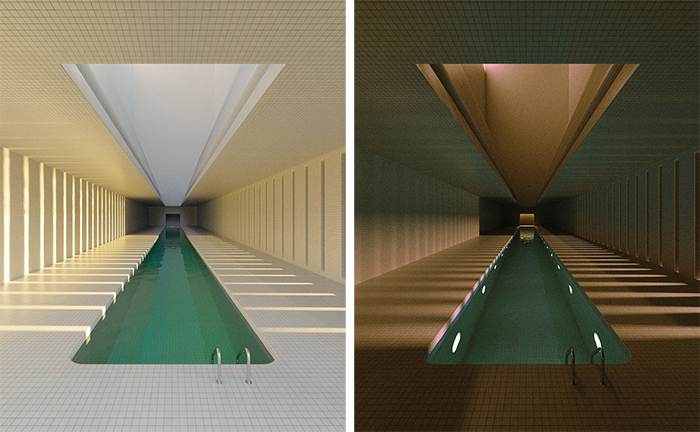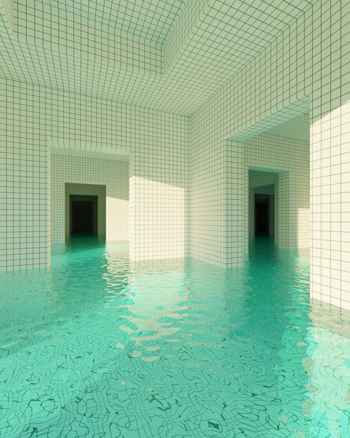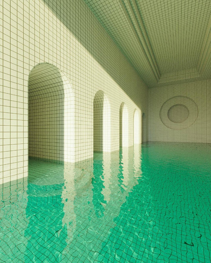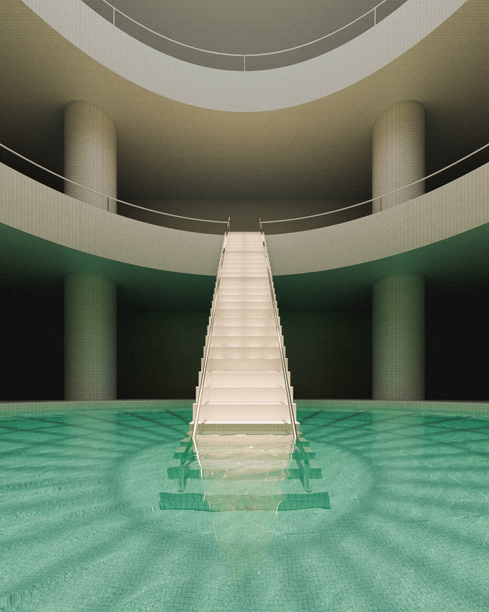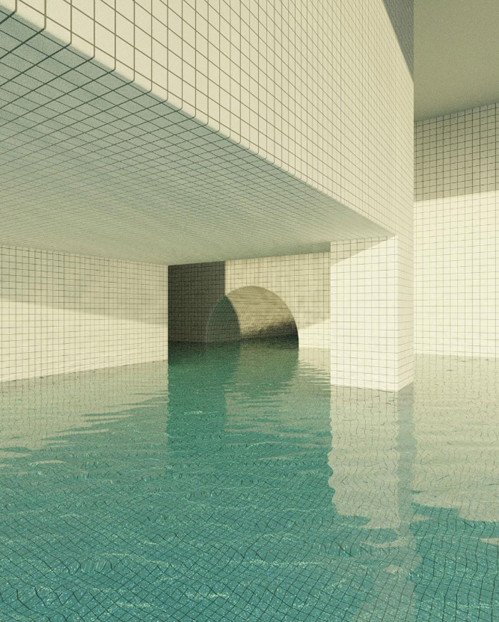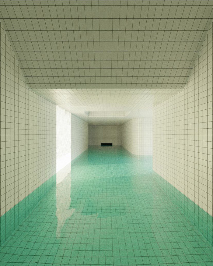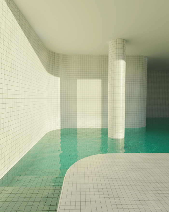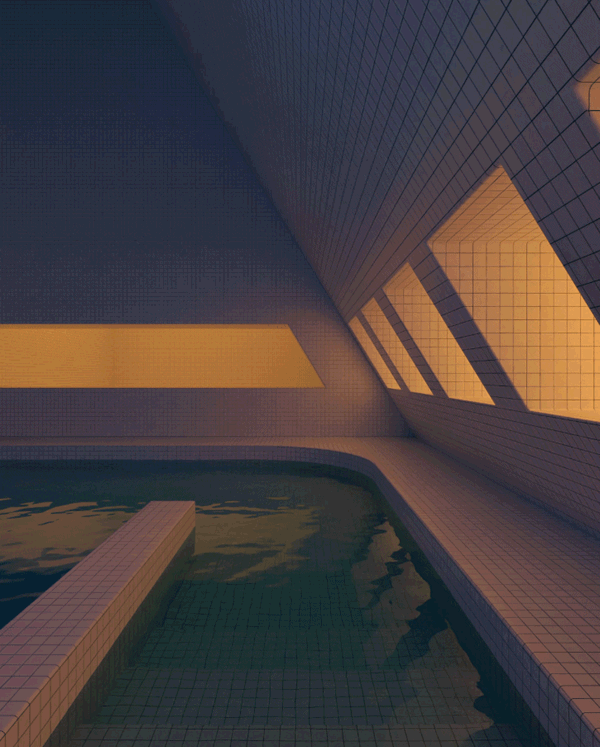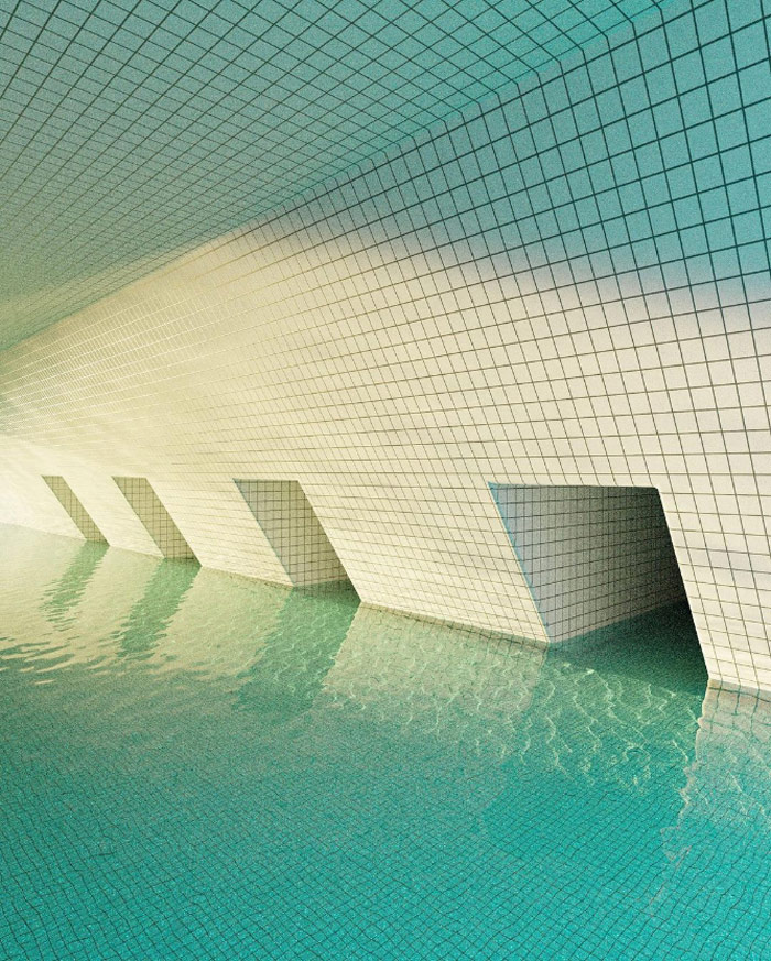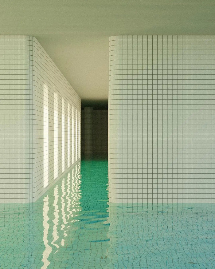 作品中的游泳池,無論是綠松石的瓷磚還是通透的水面,在現實生活中的游泳池當中十分常見;然而那些非人類的建筑結構、深處的未知陰暗空間又在告訴你這個場景的不真實性。