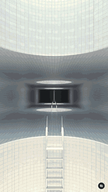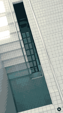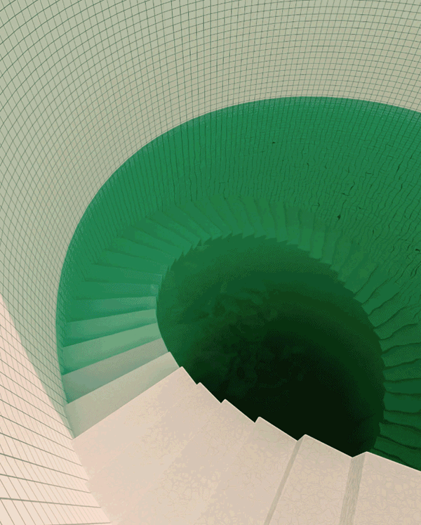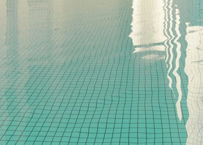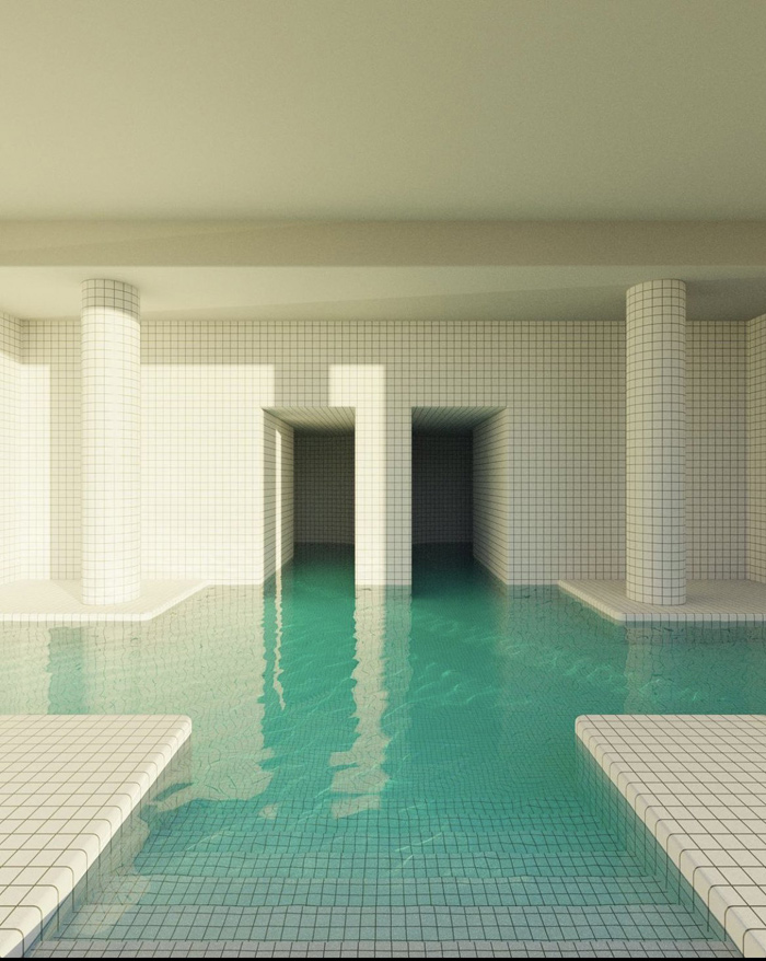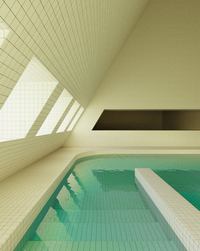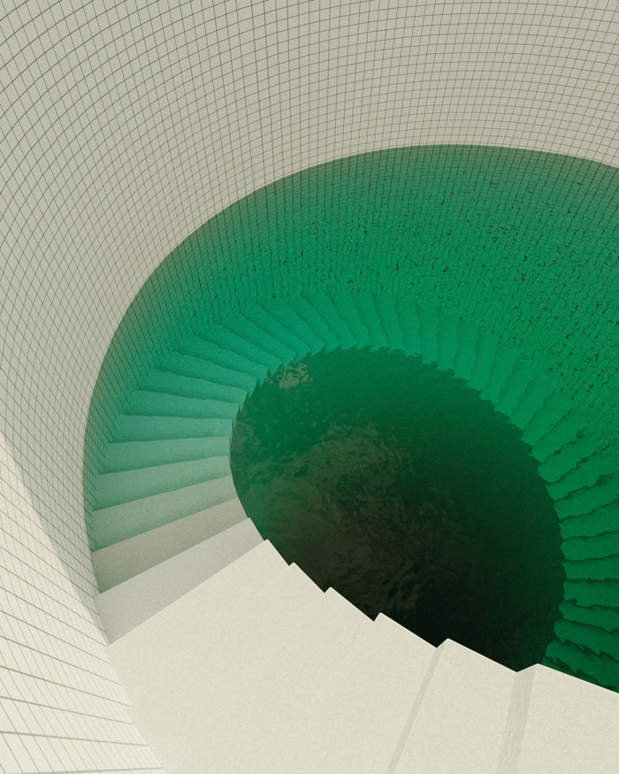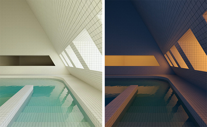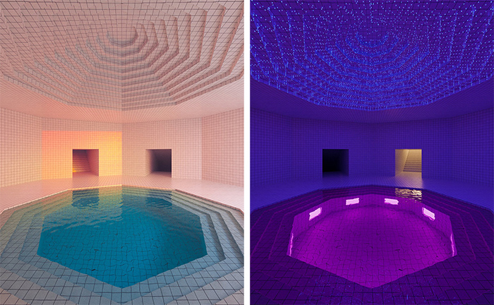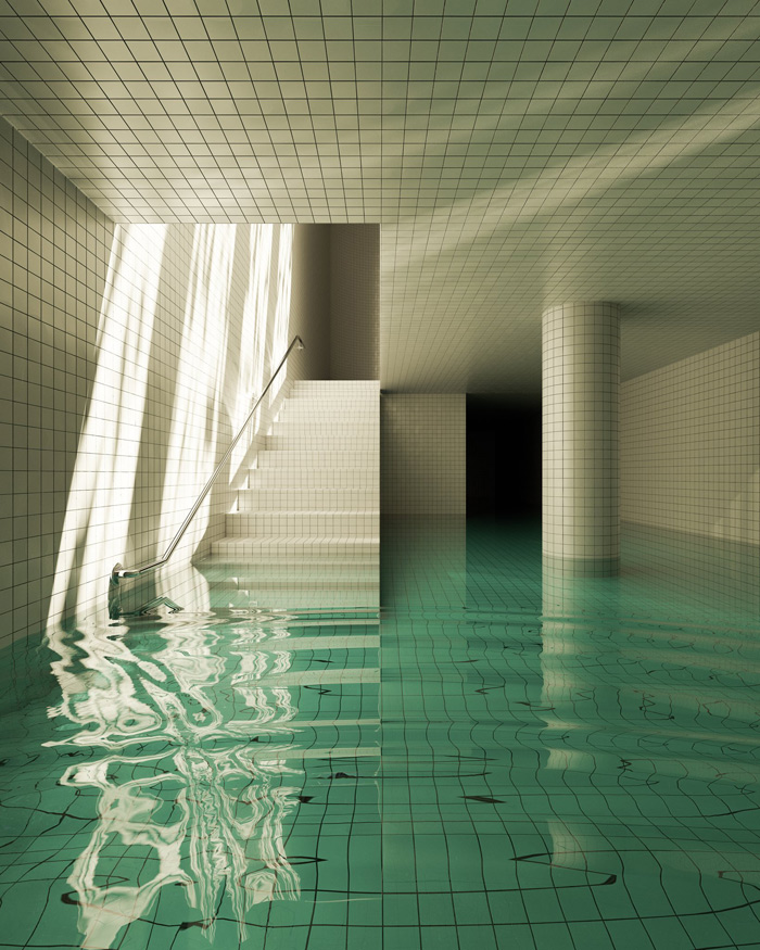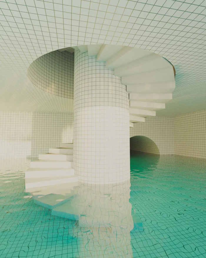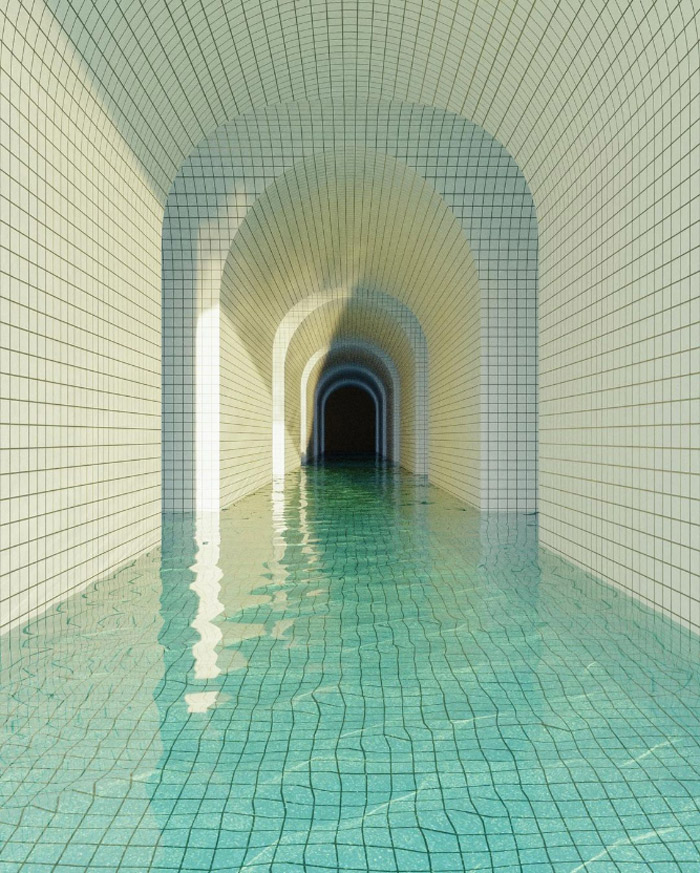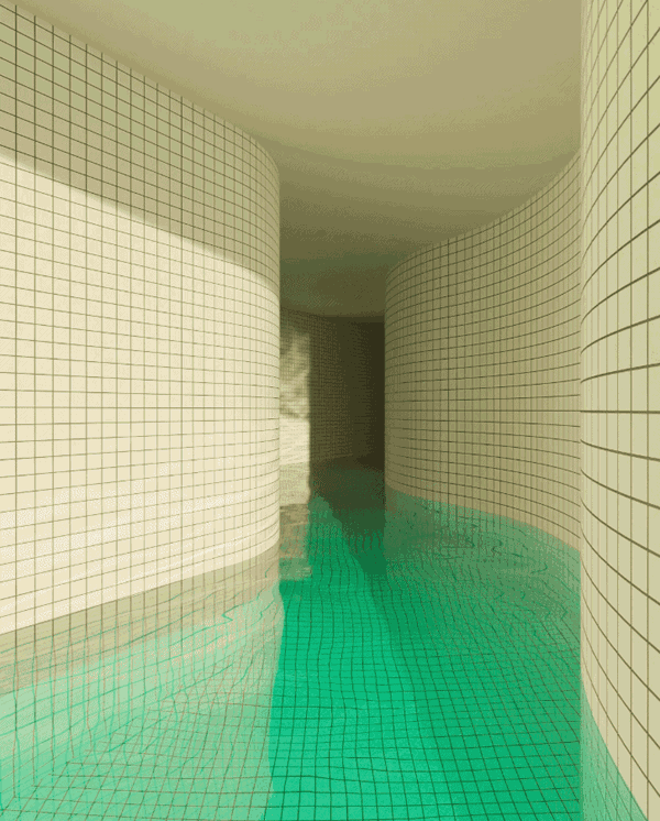 作品中的游泳池,無論是綠松石的瓷磚還是通透的水面,在現實生活中的游泳池當中十分常見;然而那些非人類的建筑結構、深處的未知陰暗空間又在告訴你這個場景的不真實性。