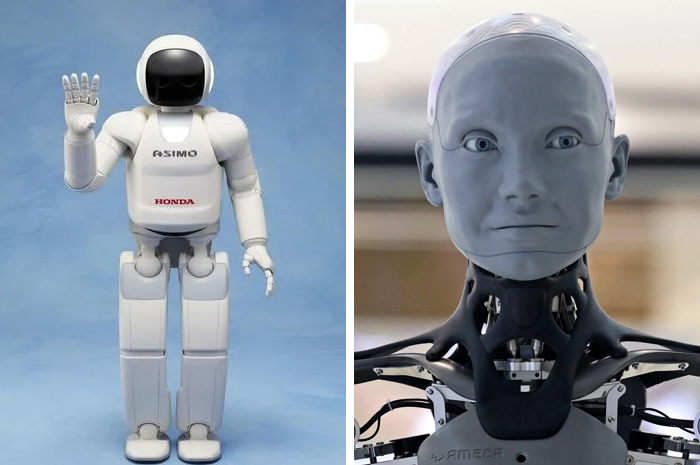 左圖為本田的ASIMO機器人(圖片來源:ROBOTS-IEEEs),右圖為英國Engineered Arts公司開發的“Ameca”機器人,面部結構靈活,可以做出豐富的人類面部表情。圖片來源:The US Sun