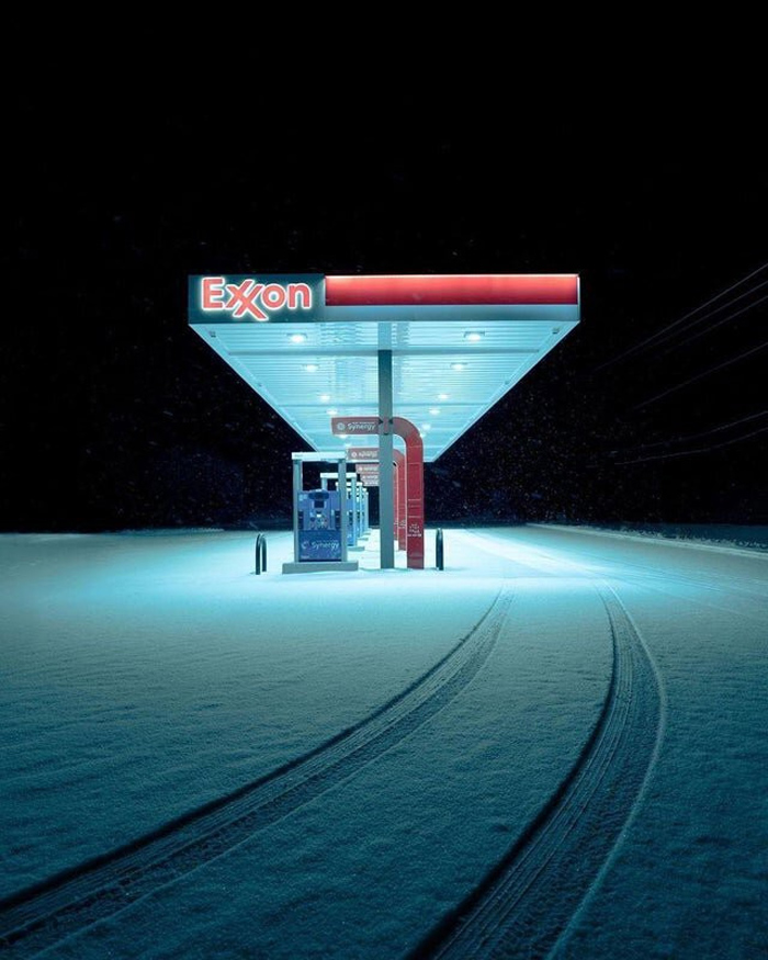曠野外空無一人的加油站燈火通明,讓人感覺既合理又突兀 。圖片來源:Medium