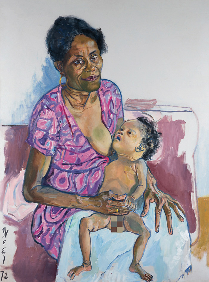 早在美國黑人平權和性少數群體運動之前,愛麗絲·尼爾就畫了大量的少數族裔、勞工階層、性少數群體和波西米亞式的藝術家,尤其是各種女性大量的出現在她的畫中。這或許是這位已故三十多年的美國畫家的作品如今在西方主流博物館不斷被展出的一個原因。如今美國當代作品中不出現女性、少數族裔和性少數群體而只是白人男性肯定是政治不正確。從二十世紀美國經濟大蕭條時期到八十年代,愛麗絲就像一位孤獨的探險者描繪了眾多并不美麗、衣著簡陋,倦怠困窘的人,這些群像更像是來自第三世界國家而不是發達富裕的美國。正如她所說,我喜歡畫失敗者,生活不如意的人。