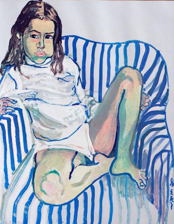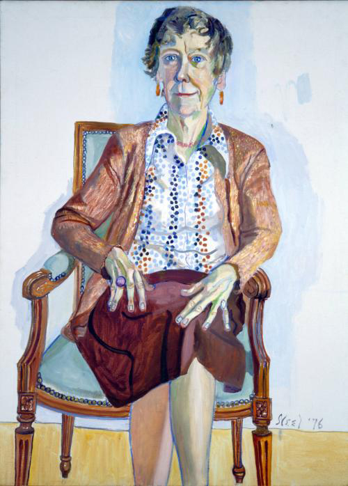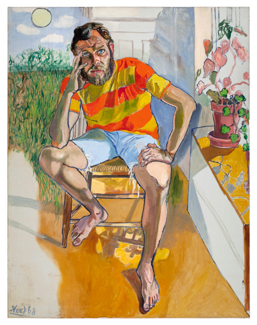 在愛麗絲·尼爾漫長的藝術生涯中經歷了很大的轉變,這是隨著社會與藝術史的變化而自然演進的過程,最早期她的畫完全是油畫體積塊面的畫法,后來受德國表現主義的影響,造型沉重厚實,六十年代之后,在抽象表現主義影響下,風格日趨輕盈,開始出現藍色輪廓線,色彩趨于明亮,比如她80歲的那張自畫像。