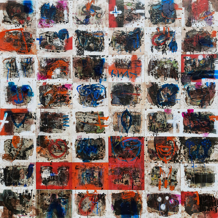 Dedy Sufriadi, Burning series 21.2, 2021, 布面丙烯顏料、木炭拼貼和噴漆, 150 x 150 cm. 致謝藝術家和Artemis Art