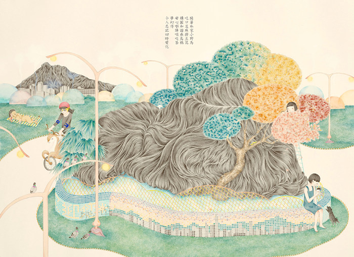 Joey Leung, Outline Of The Peak, 2022, 水粉、中國墨、日本顏料、丙烯、素描、彩鉛、和紙, 85.5 x 115 cm. 致謝藝術家和Karin Weber Gallery