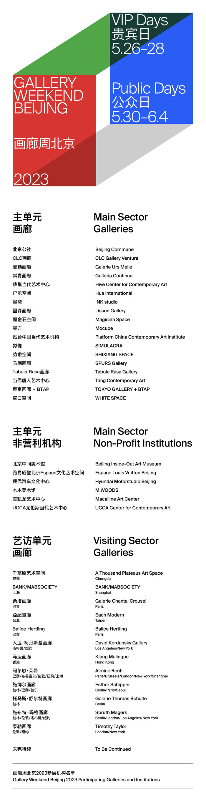 自成立以來,主單元作為畫廊周北京工作的出發點和核心,集中展示本地畫廊與非營利機構的多元面貌,呈現北京前沿的當代藝術圖景。截至目前,主單元的參展陣容將由18家畫廊與6家非營利機構共同組成。其中,里森畫廊、擬像和美凱龍藝術中心首次參展,墨齋、勢象空間、空白空間和路易威登北京Espace文化藝術空間再度回歸第七屆的年度活動。