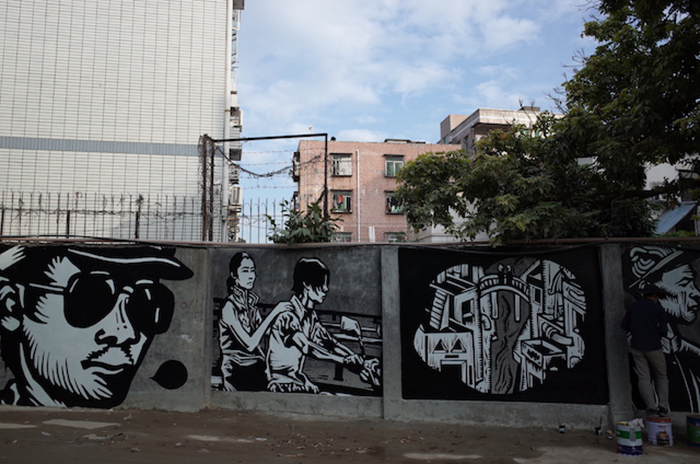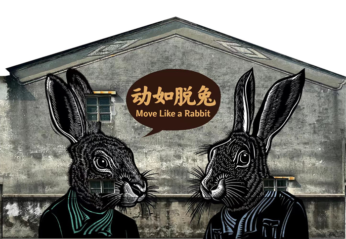 “動如脫兔”是深圳建筑雙年展坪山展區的一個委托項目,主辦方要我壁畫,在征得屋主同意后,我在老屋子墻面里創作了一對“掛著毛巾的,勞動的兔子”的壁畫,還有一系列電動三輪車的視覺作品;我覺得2023開年要有一個比較好的寓意,我,我的周圍,大家都需要互相鼓勁。