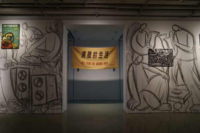 劉慶元:在這個展覽中,我是有三張版畫原作的,第一個是自己干,當時我就把自己的家當成了工作坊和印刷廠;第二個就是在青年聯合,當時出現在各種搖滾雜志,地下音樂雜志的封面和海報上;第三個就是幾個朋友在一個房間里聊天彈琴,這三幅印在牛皮紙上的木刻都創作于2000前后。其中也有十七年前使用電動工具創作的木刻原版,用各種電動工具刻在工程夾板上的。